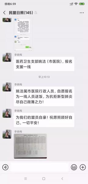 民盟醫(yī)藥衛(wèi)生支部組織委員、日照市人民醫(yī)院醫(yī)保辦副主任姚潔為一線送飯