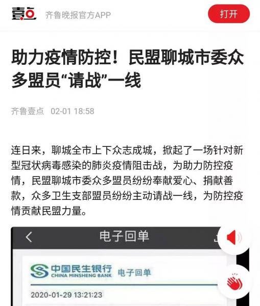 目前,民盟聊城市委已與民盟湖北省委聯(lián)系,于近期將籌集到的愛心捐款直接捐至疫區(qū)醫(yī)療機構(gòu),用于新型冠狀病毒感染肺炎疫情的防治工作。