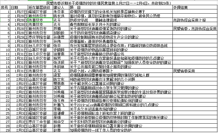 疫情牽動(dòng)著盟員的心,不論是在一線戰(zhàn)斗的盟員還是居家的盟員,沒(méi)有忘記為防疫戰(zhàn)出謀獻(xiàn)策。1月27日至2月4日民盟市委共收到并轉(zhuǎn)報(bào)民盟山東省委和市政協(xié)關(guān)于防控疫情的社情民意信息29件,其中3件被市政協(xié)、民盟省委采用轉(zhuǎn)報(bào)省政協(xié)。