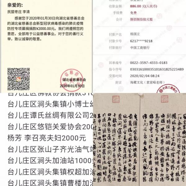 還有盟員通過(guò)所在工作單位、個(gè)人向慈善機(jī)構(gòu)捐獻(xiàn)錢(qián)物,不完全統(tǒng)計(jì)約7000元。盟員袁家峰書(shū)法作品參加義拍,將所得資金捐贈(zèng)北京韓紅愛(ài)心慈善基金會(huì),用于支援武漢。
