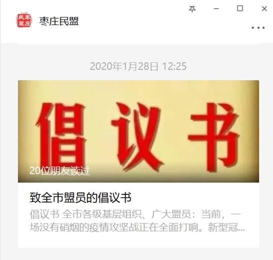突如其來(lái)的新型冠狀病毒防控工作時(shí)刻牽動(dòng)著我市廣大盟員的心。1月28日,民盟棗莊市委在微信公眾號(hào)平臺(tái)向全市盟員發(fā)出倡議。各基層組織和全體盟員嚴(yán)格服從全市疫情防控工作部署安排,全力以赴地投身于疫情防控工作。