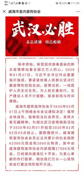 民盟市直二支部主委,威海市建筑裝飾協會會長、威海龍發(fā)百成裝飾工程有限公司總經理馬浩然個人捐款1000元,公司捐款一萬元,并組織威海市建筑裝飾協會捐款6.25萬元和價值2000元的防護服。