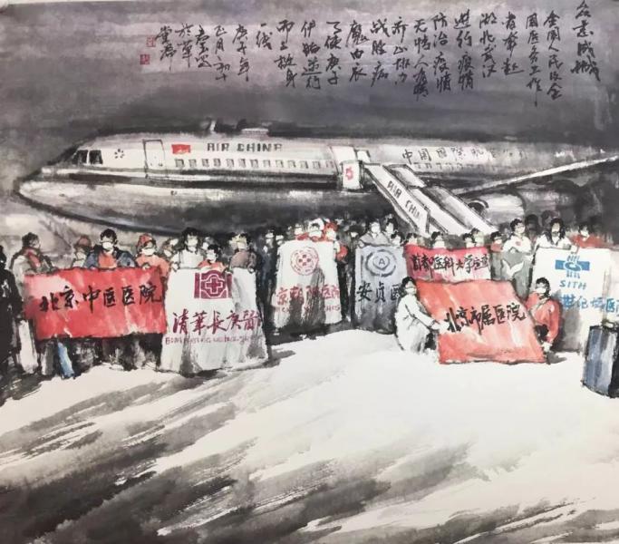 威海民盟書畫院副院長劉君玉的《眾志成城》,歌頌奔赴湖北疫情防治前線的醫(yī)務工作者。疫情無情人有情,齊心協力戰(zhàn)病魔。