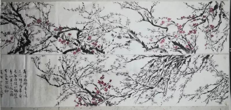 威海民盟書畫院理事、威海老年大學教師于瀟影創(chuàng)作的梅花長卷《鐵骨錚錚抗嚴霜》。