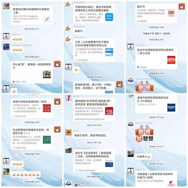 春節(jié)拜年的熱鬧勁還未散去,威海民盟微信群里,聊天頁面不斷被有關抗擊新冠肺炎的各類消息刷屏。這其中,有來自各上級及相關部門的倡議,有權威機構發(fā)布的防控疫情相關知識,也有各級統戰(zhàn)團體、民盟組織抗擊疫情的感人報道。微信群就像一個大家庭,每一個盟員都能在此感受到來自于這個家的關心、鼓勵、愛護與支持。再次,為所有民盟人點贊。