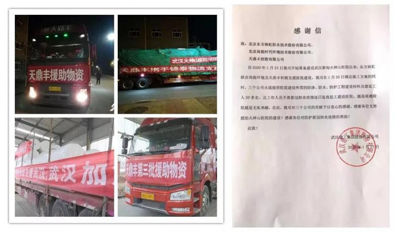 盟員企業(yè)家、天鼎豐非織造布有限公司總經(jīng)理鎮(zhèn)壘,第一時(shí)間成立緊急工作小組,協(xié)調(diào)庫存,緊急安排生產(chǎn),為武漢火神山醫(yī)院建設(shè)免費(fèi)提供16萬平方米、價(jià)值260萬元的土工布材料,用于建筑防水。第一批材料于1月26日運(yùn)抵武漢火神山醫(yī)院建設(shè)工地,總計(jì)發(fā)貨三個(gè)批次,為武漢火神山醫(yī)院順利完工提供有力的支持。