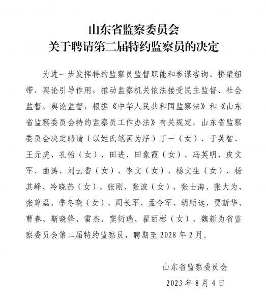 8月29日,山東省監(jiān)察委員會(huì)召開第二屆特約監(jiān)察員聘請(qǐng)會(huì)議,優(yōu)選聘請(qǐng)30名特約監(jiān)察員。省委常委、省紀(jì)委書記、省監(jiān)委主任夏紅民出席會(huì)議,向特約監(jiān)察員頒發(fā)聘書并講話。省政協(xié)副秘書長(zhǎng)、民盟山東省委會(huì)專職副主委孟令軍被聘為省監(jiān)委第二屆特約監(jiān)察員。
