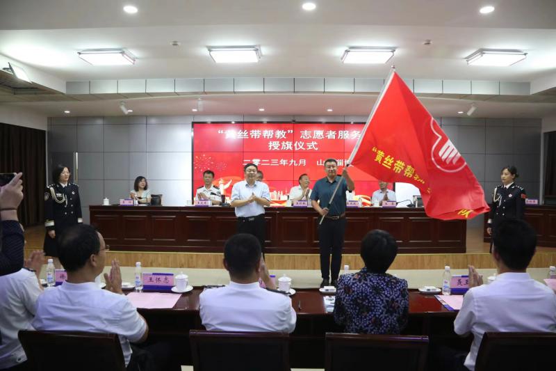 山東省政協(xié)常委、民盟省委會(huì)秘書(shū)長(zhǎng)劉加釗為淄博市“黃絲帶幫教”志愿服務(wù)隊(duì)授旗。