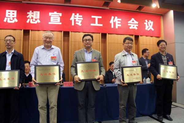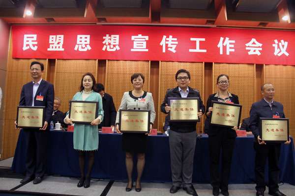 民盟省委榮獲“民盟思想宣傳工作先進集體”稱號,董利忠副主委(右一)代表上臺領獎