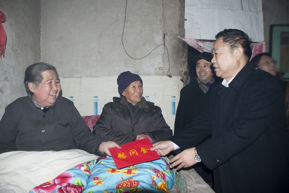儀式前,溫孚江主委一行還到孟莊村進行了實地考察,走訪慰問了村中的孤寡老人、傷病人員及革命傷殘軍人等特困戶,詳細了解了他們的生活情況,為他們送去了慰問金及食用油、大米等慰問品,并與當(dāng)?shù)卮迕襁M行了座談。