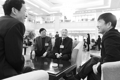 在全國政協(xié)十一屆二次會議上,韓圣浩(右一)、劉大鈞(右二))在會議討論間隙,就大學(xué)生就業(yè)等熱點(diǎn)話題發(fā)表自己的觀點(diǎn),熱烈交流。 大眾日報記者 李勇 報道