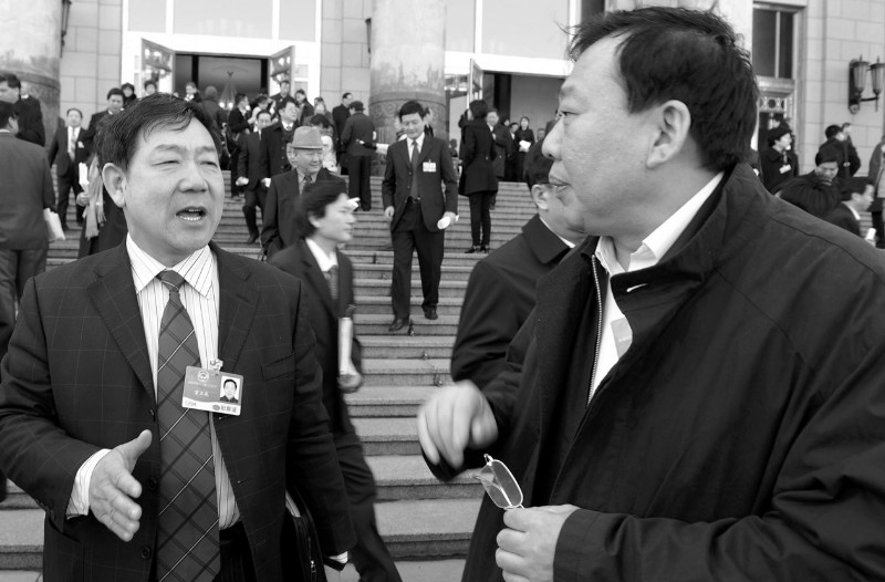 3月5日,聽完溫家寶總理的政府工作報告,全國政協(xié)委員王修林(右)深受鼓舞,與其他委員熱烈地交流著自己的感受。 大眾日報記者 李勇 報道