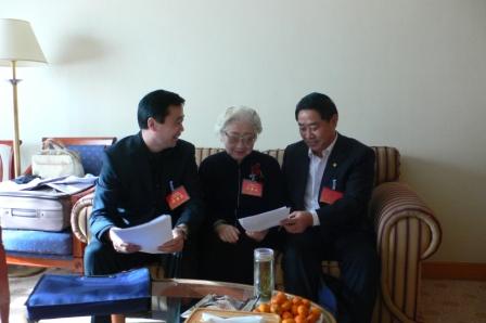 民盟山東省委主委溫孚江、專職副主委儀平策與原民盟中央副主席孔令仁討論工作報(bào)告