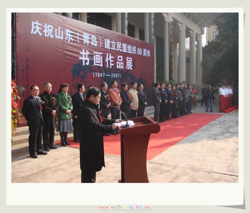民盟中央常委、山東省委主委溫孚江,中共青島市委常委、市委統(tǒng)戰(zhàn)部部長張惠,青島市人大常委會副主任孔心田,民盟中央常委、山東省委副主委、青島市委主委王修林,青島市政協(xié)副主席韓建華,市各民主黨派、工商聯(lián)負責人,山東省十三地、市民盟組織的負責人,以及青島市文化局、市文聯(lián)、市美術(shù)家協(xié)會、市書法家協(xié)會負責人出席開幕式。青島市民盟組織以及社會各界500余人參加了開幕式。會議由民盟山東省委常委、民盟青島市委副主委江玉民主持。