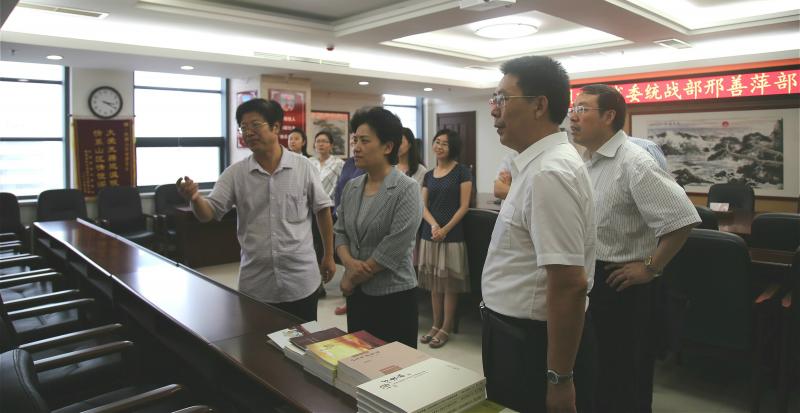 隨后,邢善萍在山東省政協(xié)副秘書(shū)長(zhǎng)、民盟省委專(zhuān)職副主委董利忠的陪同下來(lái)到了民盟省委機(jī)關(guān)一多圖書(shū)室。在圖書(shū)室,董利忠簡(jiǎn)略介紹了一多圖書(shū)室的設(shè)置由來(lái)、使用情況等,邢善萍對(duì)圖書(shū)室的設(shè)置表示肯定。