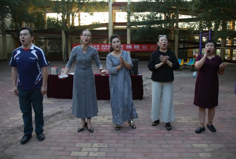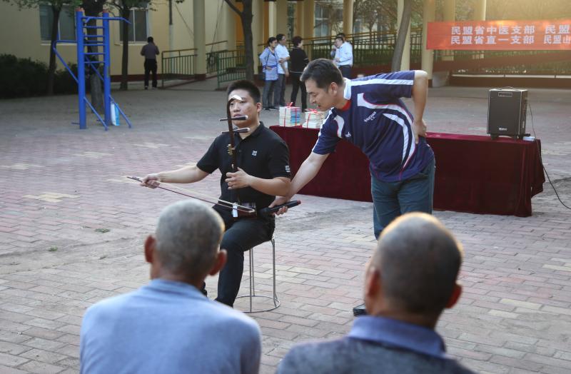 在演出慰問活動中,盟員藝術家們接著下午演出的熱情與激情,馬不停蹄進行了現(xiàn)場演出,有獨唱,有合唱,有二胡獨奏,因條件有限,表演者大都為清唱。這里有感人的一幕,當二胡演奏者江沐沐表演時,為使在場的老人們能聽得更清楚,在一旁剛剛結束演唱的歌唱家張延嶺用半蹲的姿態(tài)拿著話筒放在二胡旁邊擴音,這個姿態(tài)持續(xù)了近二十分鐘,期間,前排的一位老人前去輕輕遞過的一個小馬扎,溫暖了現(xiàn)場所有觀眾的心。雖然音響設備條件極其簡陋,既無伴奏音樂,麥克聲音還沙啞微弱時斷時續(xù),但現(xiàn)場演唱者都不顧之前演出疲勞,竭盡最大聲音為大家演唱,同老人們熱情互動。老人們也被表演者的愛心和熱情感染,沉浸期間,情不自禁地鼓起一陣又一陣掌聲。