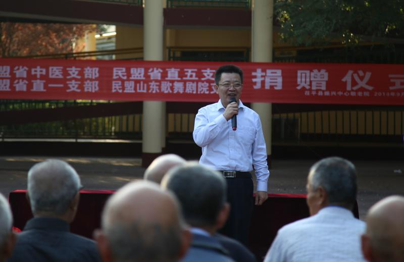 捐贈儀式結束后,參加演出活動的盟員們立即趕赴茌平振興中心敬老院,為敬老院的老人們帶來愛心和慰問。民盟省委常委、民盟聊城市委主委郝光華致辭。他首先向參加活動的各位老人們問好,向敬老院的各位工作人員表示感謝,并向大家致以節(jié)日的祝福。他指出,此次捐贈活動是由民盟省中醫(yī)支部、民盟省直五支部、民盟省直一支部、民盟山東歌舞劇院支部聯(lián)合舉辦的,目的是為敬老院的各位老人們帶來健康、快樂、知識和溫馨,希望各位老人在敬老院生活開心,健康長壽。隨后,雙方舉行了簡短的捐贈儀式,來自省直一支部的盟員們?yōu)槔先藗兙栀浟私】叼B(yǎng)生方面的圖書,前面講到的各位盟員書畫家也將自己創(chuàng)作的富有寓意的書畫作品捐贈給了敬老院。