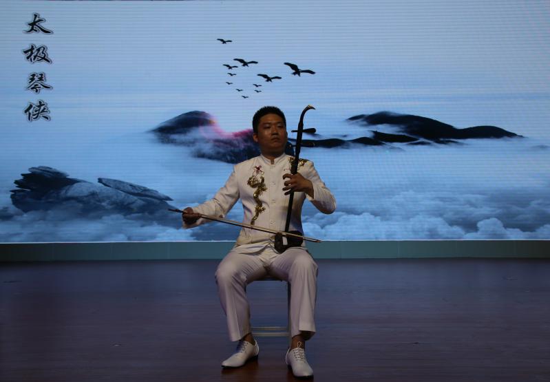 民盟山東歌舞劇院支部盟員、青年演奏家江沐沐用精湛的技藝為大家?guī)砹烁挥刑厣亩氉唷短珮O琴俠》。
