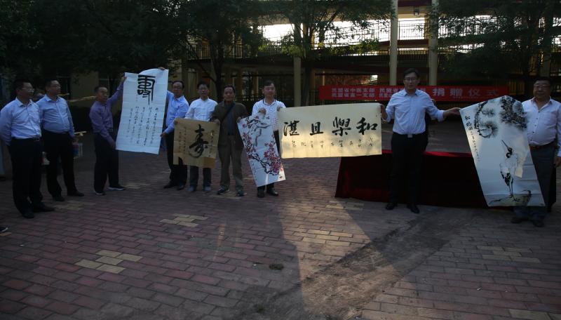 演出結束后,盟、校雙方舉行了捐贈儀式,來自省直一支部的盟員冀洪濤、張福全、劉達君,省直五支部主委張成,省歌舞劇院支部盟員王玉杰、胡玉萍等盟員書畫家將自己創(chuàng)作的富有寓意的書畫作品分別捐贈給了民盟聊城市委、茌平縣第三中學和六美傳媒有限公司。