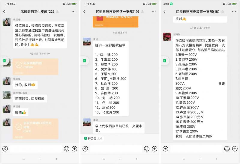 濟(jì)寧盟員張宗敏、紀(jì)利霞、肖華通過不同途徑共捐款1.4萬元;民盟省直新階層支部盟員陳軍偉積極組織參與盈科(濟(jì)南)律師事務(wù)所為河南省防汛搶險(xiǎn)救災(zāi)工作捐款活動(dòng),募集善款31250元;棗莊學(xué)院支部孫倩蓉參加了蔚來車友會組織的“十一城聯(lián)動(dòng)公益行--共舟共濟(jì),河南加電”活動(dòng)……