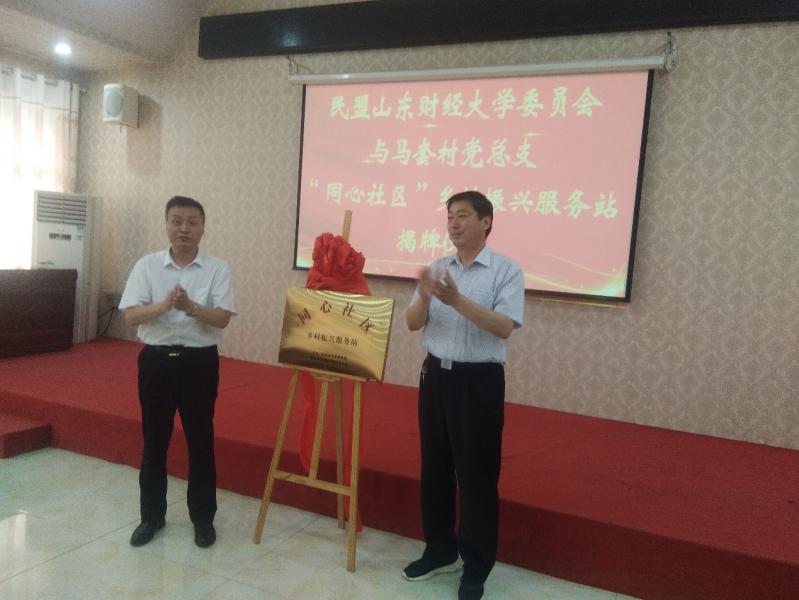 6月29日,民盟山東財(cái)經(jīng)大學(xué)委員會(huì)與濟(jì)南市長清區(qū)馬套村黨總支“魯盟同心社區(qū)”鄉(xiāng)村振興服務(wù)站揭牌儀式在濟(jì)南市長清區(qū)馬套村舉行。省人大常委會(huì)委員、民盟省委會(huì)專職副主委王睿,民盟省委會(huì)參政議政(社會(huì)服務(wù))部副部長徐濟(jì)生,山東財(cái)經(jīng)大學(xué)黨委委員、統(tǒng)戰(zhàn)部部長鄧迎迎,中共長清區(qū)委統(tǒng)戰(zhàn)部分管日常工作的副部長程慶勇,萬德街道黨工委副書記楊乾坤,馬套村黨總支書記肖舒榮等出席揭牌儀式。揭牌儀式由楊乾坤主持,鄧迎迎、程慶勇分別代表山東財(cái)經(jīng)大學(xué)黨委統(tǒng)戰(zhàn)部和中共長清區(qū)委致辭,省政協(xié)委員、民盟山東財(cái)經(jīng)大學(xué)委員會(huì)主委曲順蘭介紹了“魯盟同心社區(qū)”鄉(xiāng)村振興服務(wù)站的創(chuàng)建思路與做法,王睿與程慶勇共同為“魯盟同心社區(qū)”鄉(xiāng)村振興服務(wù)站揭牌。