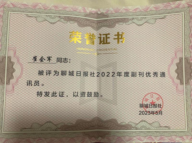 聊城盟員崔會(huì)軍被評(píng)為“2022年度聊城日?qǐng)?bào)社副刊優(yōu)秀通訊員”