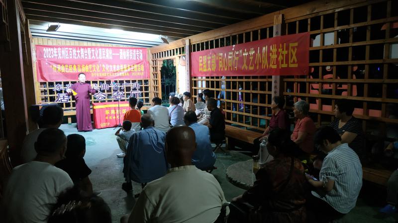 活動(dòng)現(xiàn)場(chǎng),時(shí)而掌聲雷動(dòng),時(shí)而笑聲陣陣,觀眾聚精會(huì)神地觀看,演員全身心投入演出。在社區(qū)廣大居民休閑納涼的長(zhǎng)廊里,沒有舞臺(tái),面對(duì)面近距離和觀眾互動(dòng)交流,大大增加了群眾對(duì)于傳統(tǒng)文化的參與感和融入感。