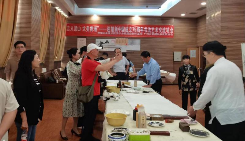 為迎接中華人民共和國成立75周年,廣泛吸取藝術(shù)創(chuàng)作素材,開展藝術(shù)創(chuàng)作“請進(jìn)來、走出去”的活動, 5月13日,中共廣州市黃埔區(qū)委統(tǒng)戰(zhàn)部一級調(diào)研員黎秀英,廣州市書法家協(xié)會理事、黃埔區(qū)書法家協(xié)會主席歐杰帶領(lǐng)黃浦區(qū)書協(xié)青年書法家一行12人來梁山縣文化館暨民盟中央美術(shù)院梁山創(chuàng)作基地開展“忠義梁山 大美黃埔”書畫藝術(shù)交流采風(fēng)活動。中共梁山縣委統(tǒng)戰(zhàn)部副部長張洪濤,民盟濟(jì)寧市委會副主委、梁山總支主委師青霞,梁山縣文旅局副局長孫繼民,民盟梁山總支一支部主委、民盟中央美術(shù)院梁山創(chuàng)作基地負(fù)責(zé)人、梁山縣文化館館長鄭冰及梁山縣書協(xié)、美協(xié)、盟員書畫家等20余人參加了交流活動。