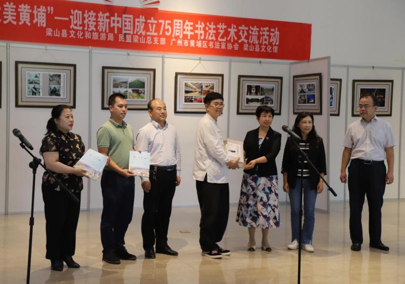 活動伊始,在梁山縣文化館一樓大廳舉行了歡迎儀式,黃埔區(qū)書協(xié)分別向梁山縣文旅局、梁山民盟贈送了黃埔書協(xié)出版的《染翰之雅》《羊城菊韻》《水書印象》等書法藝術(shù)作品集,梁山民盟向黃埔書協(xié)回贈了梁山民盟出版的《水泊梁山》系列叢書、文學(xué)期刊、盟員姜傳薪書法及梁山民盟30周年書畫專輯。孫繼民致歡迎詞,歐杰、張洪濤分別進(jìn)行了講話。
