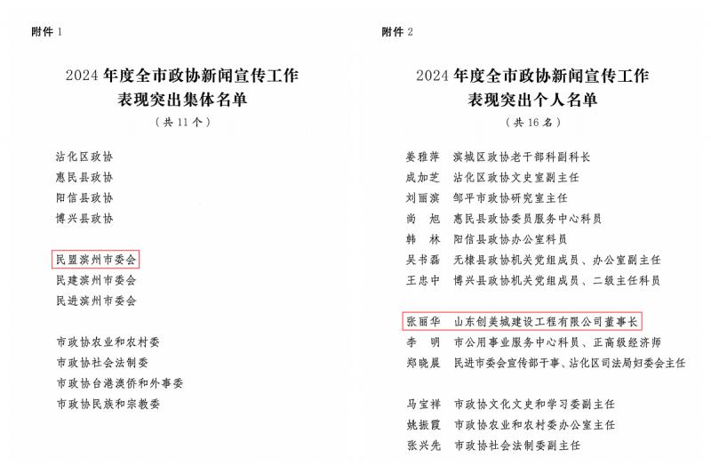 民盟濱州市委會榮獲“2024年度全市政協(xié)新聞宣傳工作表現(xiàn)突出集體”,盟員張麗華榮獲“2024年度全市政協(xié)新聞宣傳工作表現(xiàn)突出個人”。