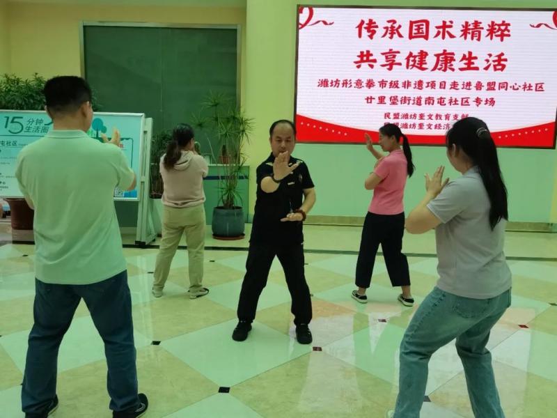 為弘揚傳統(tǒng)養(yǎng)生文化,提升群眾健康意識,倡導(dǎo)科學(xué)健身方式,7月21日,民盟濰坊奎文教育支部、經(jīng)濟支部到魯盟同心社區(qū)廿里堡街道南屯社區(qū)聯(lián)合開展形意拳培訓(xùn)教學(xué)活動。民盟濰坊體育專委會主任、奎文教育支部主委、濰坊形意拳協(xié)會會長劉龍昌,社區(qū)工作人員及部分群眾參加活動。