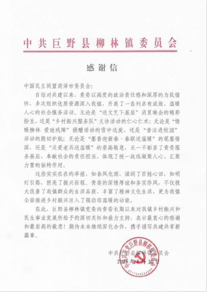 同心幫扶聚溫情 結(jié)對共建促發(fā)展——民盟菏澤市委會(huì)收到柳林鎮(zhèn)感謝信