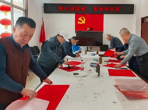活動現(xiàn)場,文房四寶一字排開,筆走龍蛇千轉(zhuǎn)成鋒。濰坊民盟書畫院的老師們滿懷熱情,揮毫潑墨,為社區(qū)居民書寫福字與春聯(lián),創(chuàng)作國畫作品,以書畫藝術(shù)傳遞溫暖,送上真摯的新春祝福。