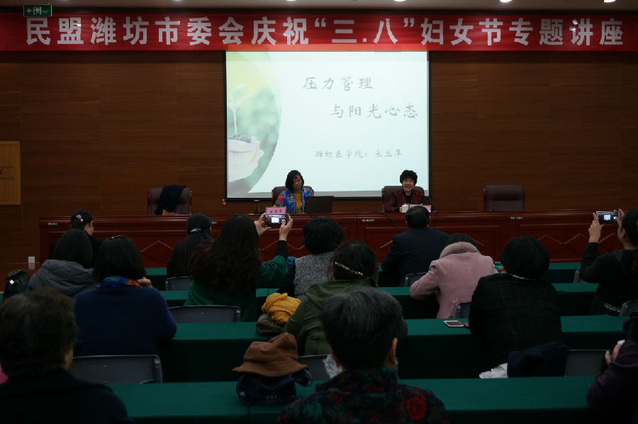 沐浴著溫暖的陽光,全市廣大女盟員們走進(jìn)會(huì)議室,滿懷喜悅,歡聚一堂,共同慶祝這個(gè)屬于自己的節(jié)日。值此節(jié)日到來之際,為幫助全市廣大女盟員在緊張忙碌的工作和生活之余,緩解各方面壓力,塑造積極、向上、樂觀、進(jìn)取的陽光心態(tài),民盟市委特邀了民盟濰坊醫(yī)學(xué)院支部委員、濰坊醫(yī)學(xué)院心理學(xué)系應(yīng)用心理學(xué)教研室主任、碩士生導(dǎo)師宋玉萍教授為大家作了“壓力管理與陽光心態(tài)”專題講座。宋玉萍教授從壓力的來源、壓力與健康的關(guān)系、壓力的影響因素和如何樹立陽光心態(tài)緩解壓力等方面做了形象生動(dòng)的講解,對今后大家能夠更加愉快的工作、更加幸福的生活大有裨益。整個(gè)講座可謂是精彩紛呈、妙趣橫生,給大家?guī)砹艘环菥翊蟛汀?/span>