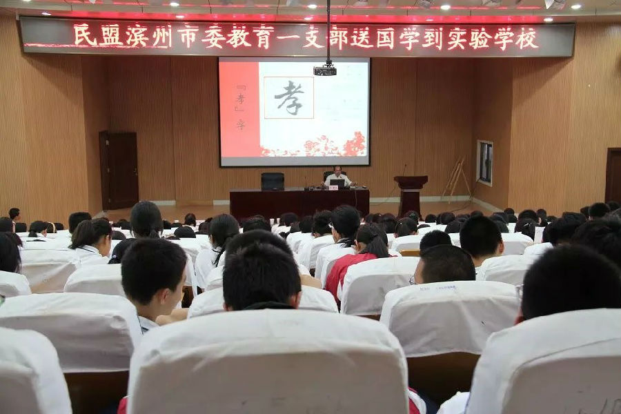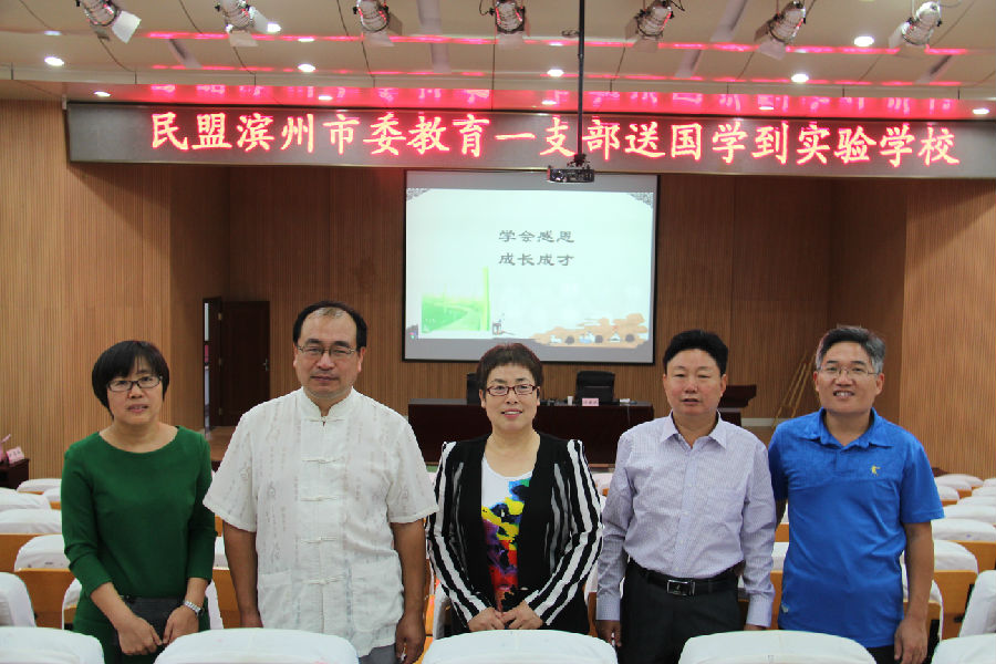 2015年9月22日,民盟濱州教育一支部經(jīng)過精心組織和認真籌備,與濱州實驗學校反復溝通對接后,民盟濱州市委員會婦女委員會主任、濱州教育一支部主委、濱州學院工會副主席劉金杰帶領支部盟員、濱州市培風書院院長、濱州市杜氏文化研究會副會長杜建廷,支部委員、濱州市心理學會副會長兼秘書長、濱州學院副教授朱洪發(fā),市實驗學校九年級級部主任張曉媛,新盟員、濱州學院航空工程學院博士伊厚會等一行五人,到市實驗學校開展“送國學到校園”活動。