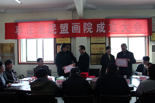 會上,宣讀了民盟棗莊市委關(guān)于成立棗莊民盟畫院的決定,宣讀并通過了棗莊民盟畫院章程。民盟盟員、中國美協(xié)會員、棗莊市群藝館館長徐隆當(dāng)選為院長。會議向畫院理事會成員和院長、副院長、秘書長頒發(fā)了聘書。