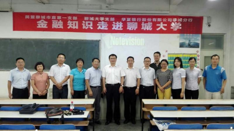 2016年9月4日,民盟聊城市直第一支部、聊城大學支部攜手華夏銀行聊城分行在聊城大學材料學院舉行了“金融知識走進聊城大學”活動。聊城大學材料科學與工程學院黨委副書記任保印、民盟聊城市市委委員陳雪梅、華夏銀行聊城分行副行長路海、民盟聊城市直第一支部主委呂明、聊城大學支部主委儀修杰以及華夏銀行聊城分行營業(yè)部副經理王斌等參加活動;顒佑擅衩肆某谴髮W支部主委儀修杰主持。