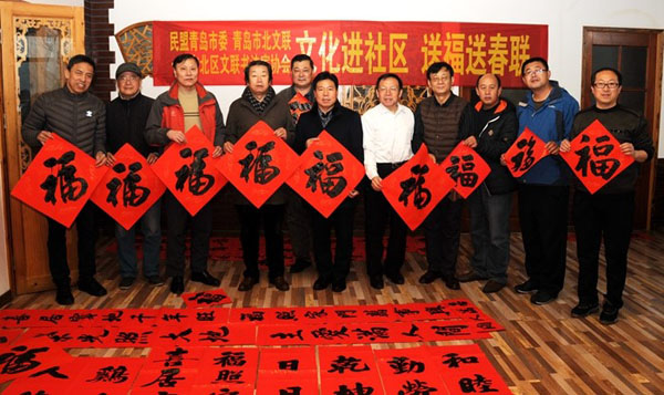 2017年1月8日,民盟青島市委組織民盟嶗山區(qū)工委和青島市民盟美術(shù)研究會(huì),聯(lián)合青島市市北區(qū)文聯(lián)、市北區(qū)文聯(lián)書法家協(xié)會(huì)赴嶗山區(qū)北宅街道南北嶺社區(qū)開展“文化進(jìn)行社區(qū)送福送春聯(lián)”活動(dòng)。書法家張景、王登勝、繆九永、孫東正、徐維克、李典昴、宮筱岱、遲延勝等參加活動(dòng)。書法家們揮毫潑墨,為聞?dòng)嵍鴣淼纳鐓^(qū)村民書寫了近百幅吉祥喜慶、翰墨飄香的春聯(lián)和福字,飄著墨香的春聯(lián)深受老百姓的歡迎,博得了在場(chǎng)社區(qū)村民的贊譽(yù)。送春聯(lián)下鄉(xiāng)活動(dòng),把文化和祝福送給農(nóng)戶,滿足了廣大群眾的節(jié)慶文化需求,也營(yíng)造了健康文明、溫馨和諧的迎新春文化氛圍。
