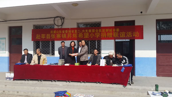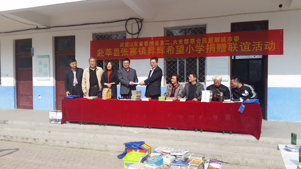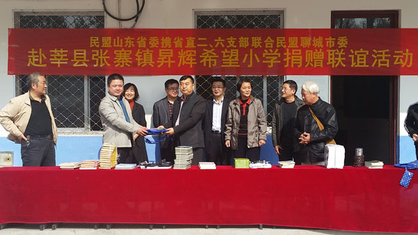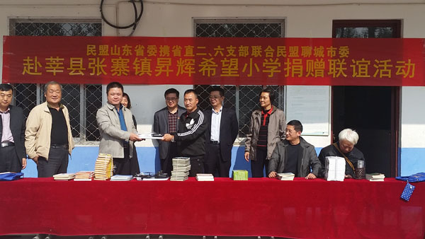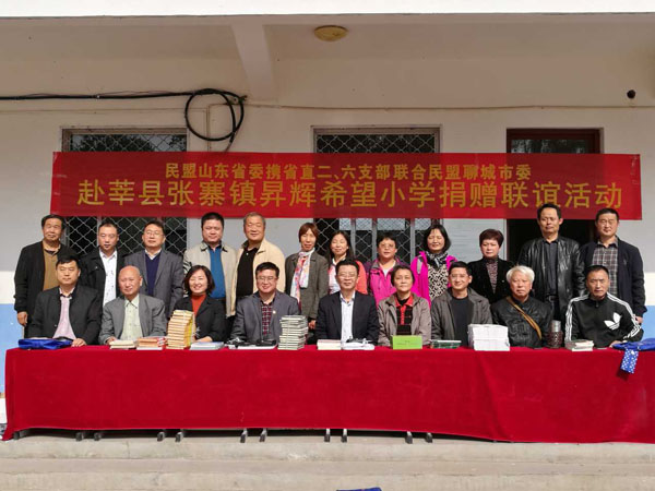 2017年10月28日上午,民盟山東省直二、六支部聯(lián)合民盟聊城市委赴莘縣張寨鎮(zhèn)昇輝希望小學(xué)捐贈(zèng)聯(lián)誼活動(dòng)。盟員、中國(guó)書(shū)畫(huà)協(xié)會(huì)山東省畫(huà)院名譽(yù)院長(zhǎng)、中華禪學(xué)安詳書(shū)畫(huà)學(xué)院院長(zhǎng)朱錫實(shí),山東省交通廳環(huán)保專家宋震野,山東省圖書(shū)館研究館員李群,山東省能源設(shè)計(jì)院專家鄭宜濤,山東省總工會(huì)報(bào)刊主編、山東省青年書(shū)法家協(xié)會(huì)副主席張樹(shù)新,山東省發(fā)明家協(xié)會(huì)秘書(shū)長(zhǎng)陳明泉,山東路軍教育咨詢有限公司、山東空一航空服務(wù)有限公司董事長(zhǎng)鞏曰路等近20名專家學(xué)者參加了本次活動(dòng)。民盟聊城市委主委、市政協(xié)常委郝光華,莘縣統(tǒng)戰(zhàn)部副部長(zhǎng)王妹榮,張寨鎮(zhèn)黨委書(shū)記蔡立新陪同活動(dòng)。