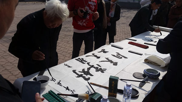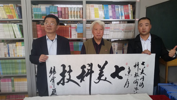 朱錫實(shí)、張樹(shù)新現(xiàn)場(chǎng)為昇輝希望小學(xué)贈(zèng)送書(shū)法作品和繪畫(huà)作品。朱錫實(shí)的一幅“一躍成龍”充滿了對(duì)孩子們發(fā)自內(nèi)心的期盼和祝福,一幅“寓教于樂(lè)”寄托了對(duì)教師的殷勤的期盼;張樹(shù)新的隸書(shū)“天道酬勤”希望孩子們銳意進(jìn)取,勇攀高峰,有一分耕耘,就有一分收獲。