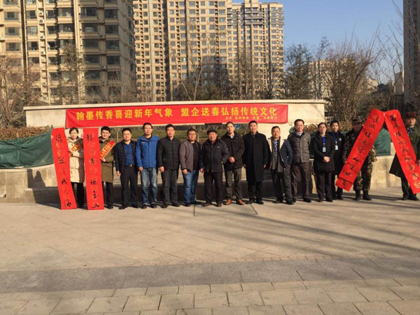 當天上午,雖然氣溫很低,但是盟內書法名家李正君、李德全、宋西斌等一行六人早早到達現(xiàn)場,大家熱情洋溢。筆墨紙硯準備妥當后,書法家們隨即揮毫潑墨,隨著小區(qū)居民的陸續(xù)趕來,現(xiàn)場熱鬧非凡;顒娱_始沒多久,現(xiàn)場就被居民們的贊揚聲包圍了。一位中年居民高興地說:“這次有幸能拿到書法家寫的春聯(lián),甭提多高興了,我回家一定要把這火紅的春聯(lián)貼在家門口,希望新的一年能夠平平安安”。針對有些居民提出的個性化要求,書法家們都盡可能予以滿足。在這次送春聯(lián)的現(xiàn)場,有的居民排不上隊,就爭先恐后地從書法家已寫好的對聯(lián)中挑選,對已經(jīng)拿到手的新年春聯(lián)高興地欣賞著、細細地品味著、紛紛贊不絕口。有年齡長些的居民說:“印刷的春聯(lián)雖然很漂亮洋氣,但是終究不是寫的,還是看著這手寫的春聯(lián),更能感受到老輩子過節(jié)的味兒!”