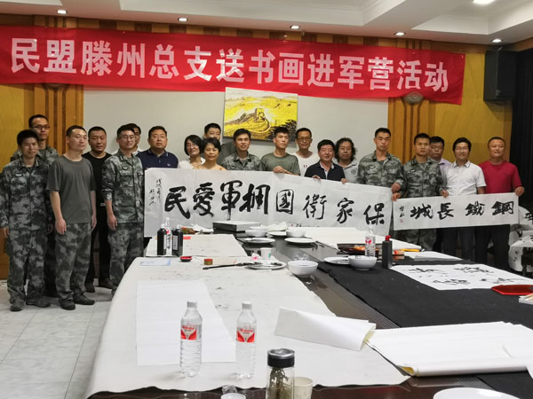 2018年7月31日,民盟棗莊市滕州總支組織盟員書畫家開展送書畫進(jìn)軍營(yíng)擁軍活動(dòng)。民盟棗莊市委副主委、民盟滕州市總支主委、滕州市人大常委會(huì)副主任劉茜,中共滕州市委統(tǒng)戰(zhàn)部副部長(zhǎng)梁西誠(chéng)帶領(lǐng)滕州民盟的書畫家張純峰、曹永、梁軍、趙聯(lián)琦、褚夫友、王棟等一行11人,走訪慰問部隊(duì)官兵,并向他們致以節(jié)日的問候和美好的祝愿。
