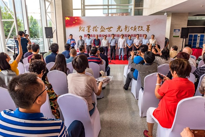 陳立波代表民盟青島市委致辭。他指出,四十年來,中國(guó)共產(chǎn)黨帶領(lǐng)全國(guó)人民接力推進(jìn)改革開放偉大事業(yè),開啟了中華民族偉大復(fù)興的時(shí)代篇章。特別是黨的十八大以來,在以習(xí)近平同志為核心的中共中央帶領(lǐng)下,中國(guó)特色社會(huì)主義事業(yè)開辟了新的時(shí)代征程。四十年來,多黨合作事業(yè)蓬勃發(fā)展,民盟青島市委始終與中國(guó)共產(chǎn)黨并肩同行、同頻共振,近年來,民盟市委努力在會(huì)協(xié)商、善議政上展現(xiàn)實(shí)效,為改革開放事業(yè)凝聚智慧、凝聚人心、凝聚力量。四十年來,民盟藝術(shù)家慷慨揮毫,積累了豐富的藝術(shù)成果,展現(xiàn)了對(duì)中國(guó)特色社會(huì)主義文化事業(yè)的堅(jiān)定自信。他強(qiáng)調(diào):四十年來,改革開放取得的偉大成就,再一次雄辯的證明,中國(guó)共產(chǎn)黨是帶領(lǐng)全國(guó)人民走向一次次勝利的掌舵人。民盟青島市委將以本次展出為新的契機(jī),繼續(xù)引導(dǎo)廣大盟員加強(qiáng)對(duì)中國(guó)特色社會(huì)主義政治道路的深刻認(rèn)同,帶領(lǐng)全市盟員緊密團(tuán)結(jié)在以習(xí)近平同志為核心的中共中央周圍,在新時(shí)代多黨合作舞臺(tái)上展現(xiàn)新面貌、開拓新優(yōu)勢(shì),做出新貢獻(xiàn)!