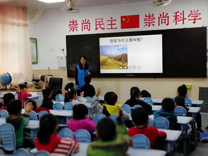 之后,志愿者耿新燕又通過(guò)“駱駝的啟示”,告訴同學(xué)們無(wú)論身處什么環(huán)境,都要積極生活、堅(jiān)持不懈等道理。最后,大家一起朗讀了著名作家郭沫若的詩(shī)歌《駱駝》,再一次領(lǐng)略了“沙漠之舟”――駱駝的無(wú)限魅力。