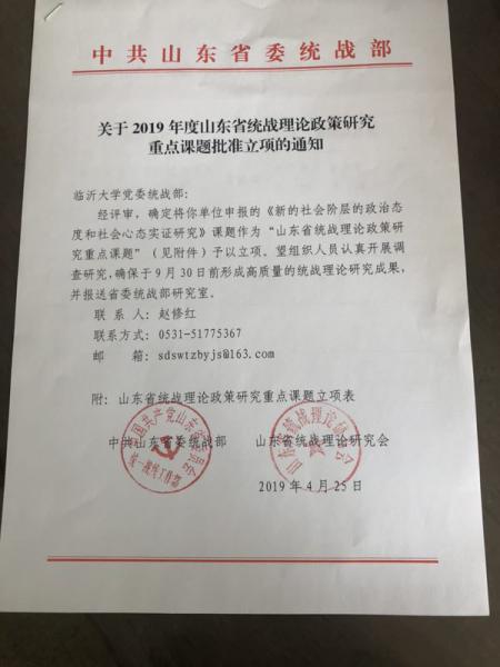 近日,民盟臨沂大學(xué)總支向中共山東省委統(tǒng)戰(zhàn)部申報的課題《新的社會階層的政治態(tài)度和社會心態(tài)實證研究》獲2019年度山東省統(tǒng)戰(zhàn)理論政策研究重點課題批準立項。課題主持人齊春宇副教授、課題主要成員公靜等均為民盟盟員。