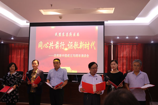 為慶祝中華人民共和國成立70周年,落實開展“不忘合作初心,繼續(xù)攜手前進”主題教育活動,民盟聊城市東昌府區(qū)委于2019年9月26日在會議室舉辦“同心共前行,謳歌新時代”——慶祝新中國成立70周年誦讀會。民盟聊城市委主委郝光華,中共東昌府區(qū)委常委、統(tǒng)戰(zhàn)部部長董勝軍,常務副部長房丹莊蒞臨活動現(xiàn)場。民盟聊城市委副主委、東昌府區(qū)委主委閆淑青及50余名盟員參加活動。