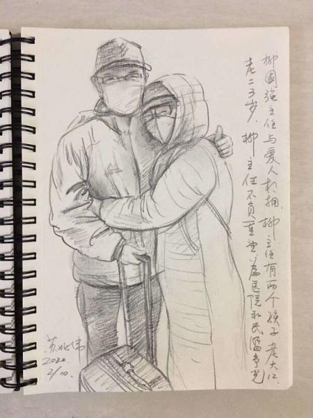 青島大學(xué)基層委員會(huì)的蘇兆偉老師,感動(dòng)于柳國強(qiáng)主任的行動(dòng),為柳主任疾筆作畫,一氣呵成。