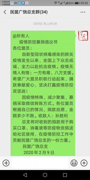 面對這次突如其來的新冠肺炎和嚴(yán)峻的疫情防控形勢,民盟東營廣饒總支認(rèn)真貫徹落實民盟東營市委和上級文件精神,積極響應(yīng)有關(guān)新冠肺炎疫情防控要求和倡議,號召全體盟員投入到疫情防控的大局中。