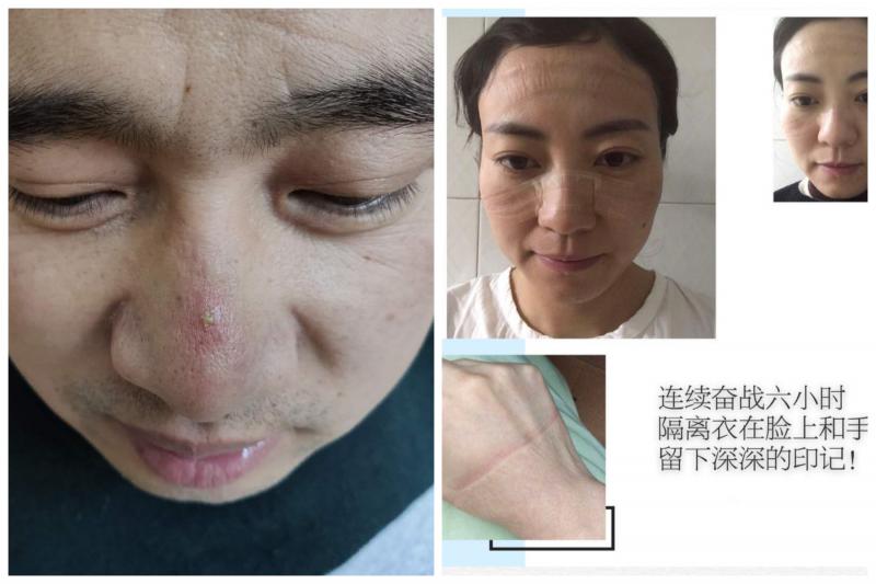 N95口罩他們一戴就是4個(gè)小時(shí),壓痕、勒痕等不到恢復(fù)又要再一次戴上4個(gè)小時(shí),從而導(dǎo)致臉部皮膚破損。防護(hù)服看上去像航天服一樣酷,但真正穿進(jìn)去才知道又厚又悶,緊急搶救時(shí)汗水淋漓相當(dāng)于蒸桑拿,護(hù)目鏡很快就會(huì)蒙上一層水汽,變得模糊;后半夜,隨著氣溫下降,衣服被汗水粘在了后背,防護(hù)服內(nèi)變得又濕又冷。其中辛苦真是誰(shuí)用誰(shuí)知道,可他們一穿至少又是4個(gè)小時(shí)。