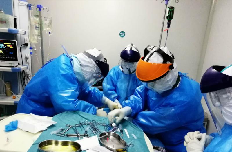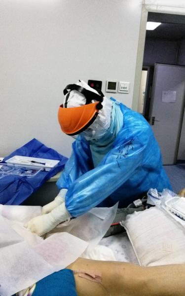 因?yàn)樵冢桑茫諘?huì)遇到各種突發(fā)情況,陳贊平時(shí)就精心鉆研業(yè)務(wù)技能,已從醫(yī)26年的他把自己訓(xùn)練成“全能型”醫(yī)生,以備緊急需要。在切開(kāi)新冠肺炎危重病人氣管的時(shí)候,是病毒載量最大、呼吸道瞬間迸發(fā)的時(shí)候,也是傳染性最強(qiáng)的時(shí)候,這種手術(shù)屬極高危的操作,稍有不慎就有被感染的風(fēng)險(xiǎn),在這種特殊情況下,能夠熟練掌握氣管切開(kāi)等操作技能的ICU人,責(zé)無(wú)旁貸,再大的危險(xiǎn)也要頂上。2月13日,陳贊一次性成功地完成了氣管切開(kāi)手術(shù)。血液濾過(guò)深靜脈置管操作有很高的要求,在負(fù)壓病房里,進(jìn)行此種操作要帶三層手套,而技術(shù)高超的陳贊又是一次成功。